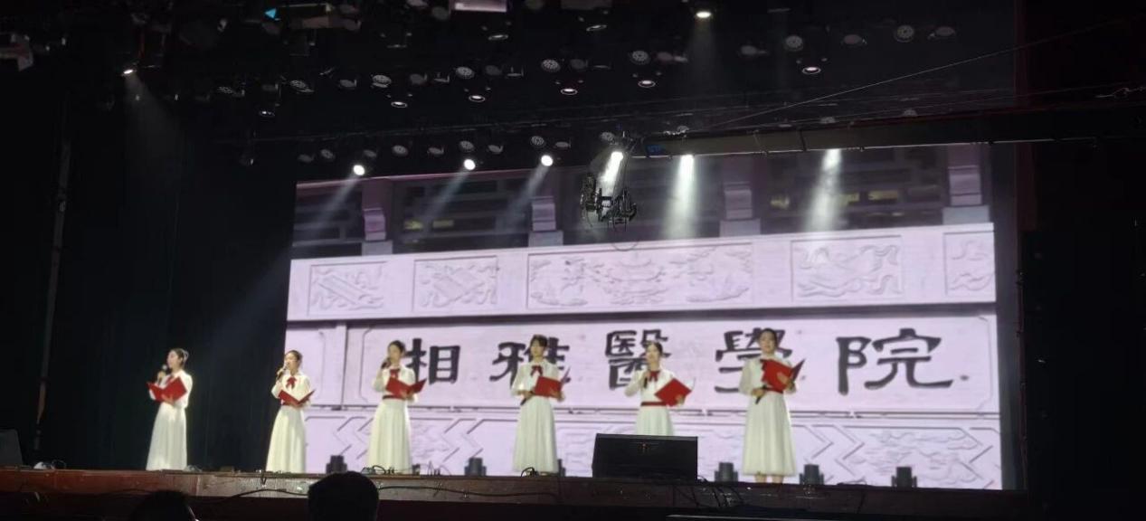 湘雅医学院的同学们带来的诗朗诵。深情的朗诵如同对湘雅历史与精神的赞歌。在医路远航的征程中,湘雅的精神如同灯塔,照亮前行的道路,诗朗诵将这份深厚的情感与敬意完美呈现。湘雅师生合唱《湘雅医学院院歌》,以庄严浑厚的歌声诠释学院百年精神内核。这首诞生于1941年的院歌,凝练着“公勇勤慎、诚爱谦廉”的院训,承载着战火年代中湘雅人“历尽艰难颠沛,壮气直无前”的坚守。它的唱响,既是跨越时空的薪火传承,亦是当代湘雅人对使命的集体宣誓。