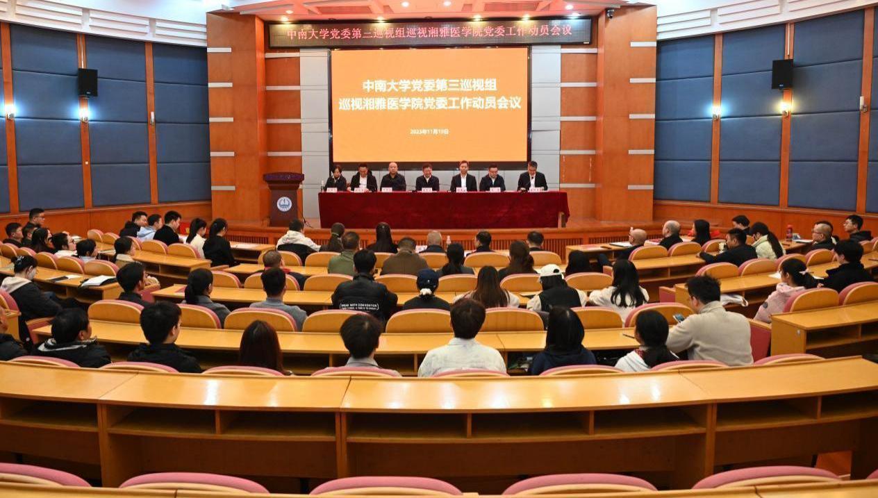 根据学校党委巡视工作统一部署,2025年11月19日,学校党委第三巡视组巡视湘雅医学院党委工作动员会议在杏林校区福庆楼学术报告厅召开。中南大学党委常委、副校长黎志宏出席会议并讲话,湘雅医学院党委书记朱利勇主持会议并作表态发言。党委组织部副部长张志宏,第三巡视组组长胡玉玺、副组长肖睿、钟旭东及其他成员,湘雅医学院领导班子成员、内设机构负责人、党支部书记、教职工及学生代表参加了会议。