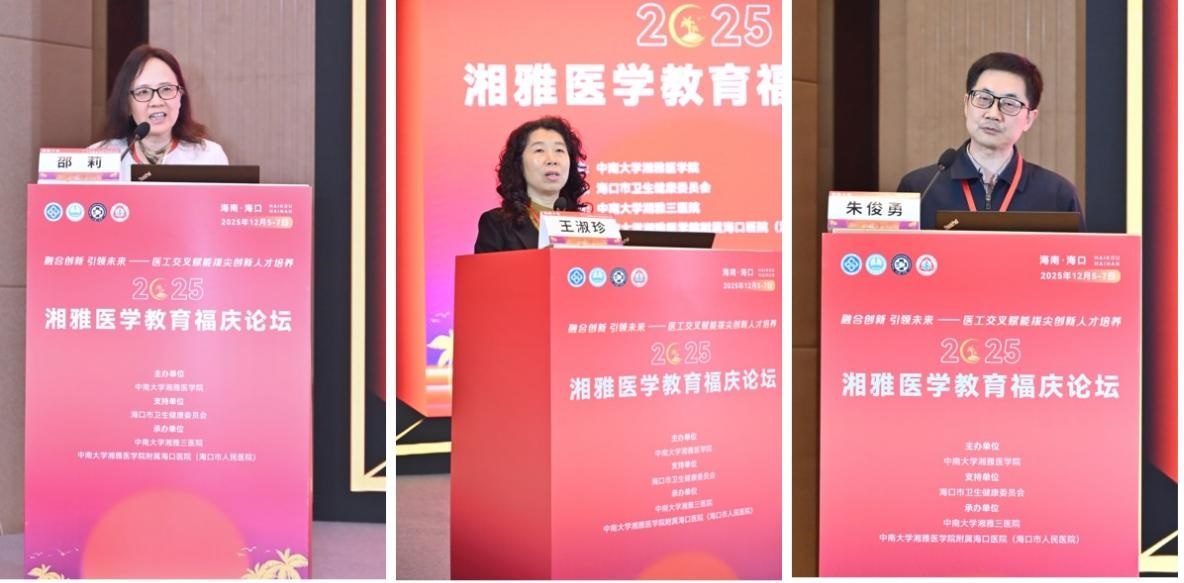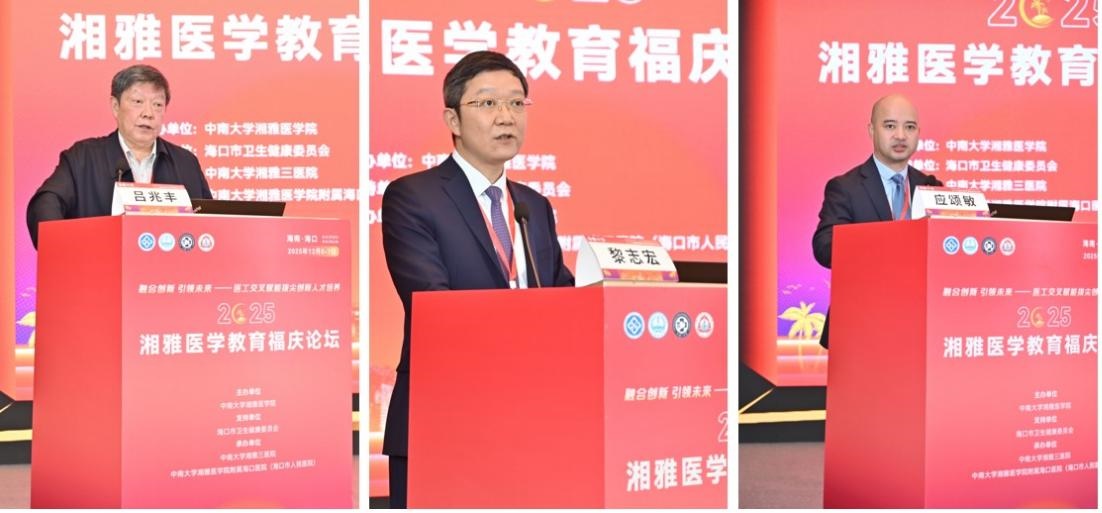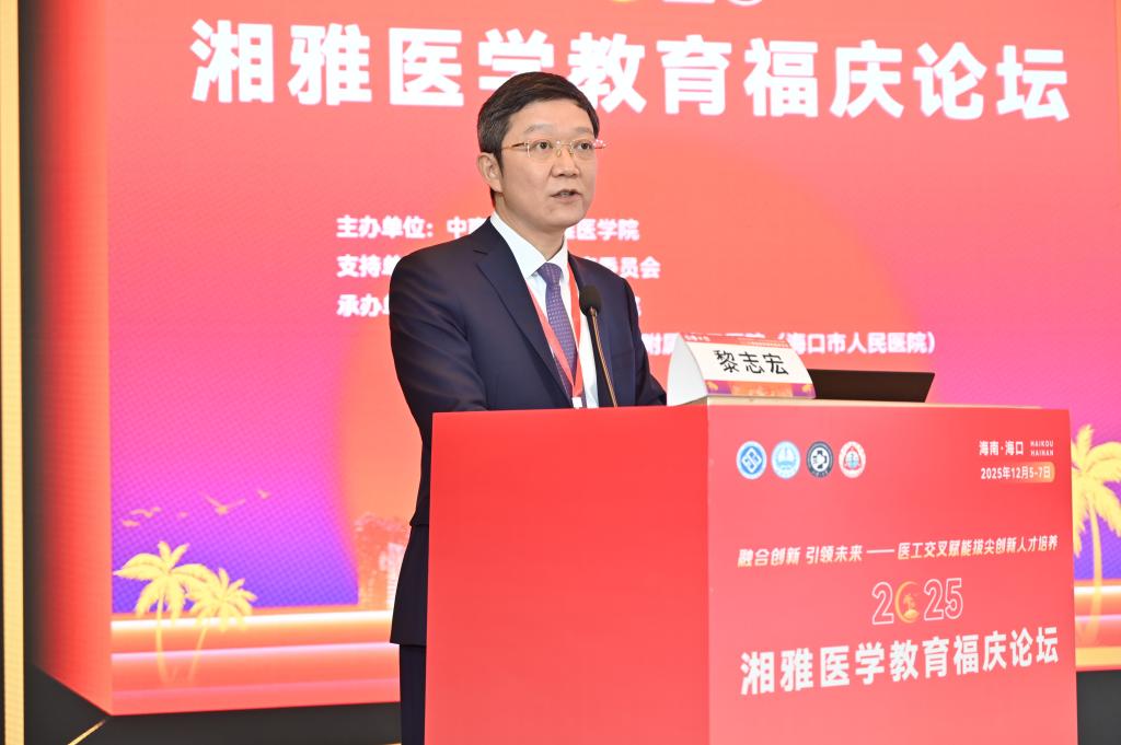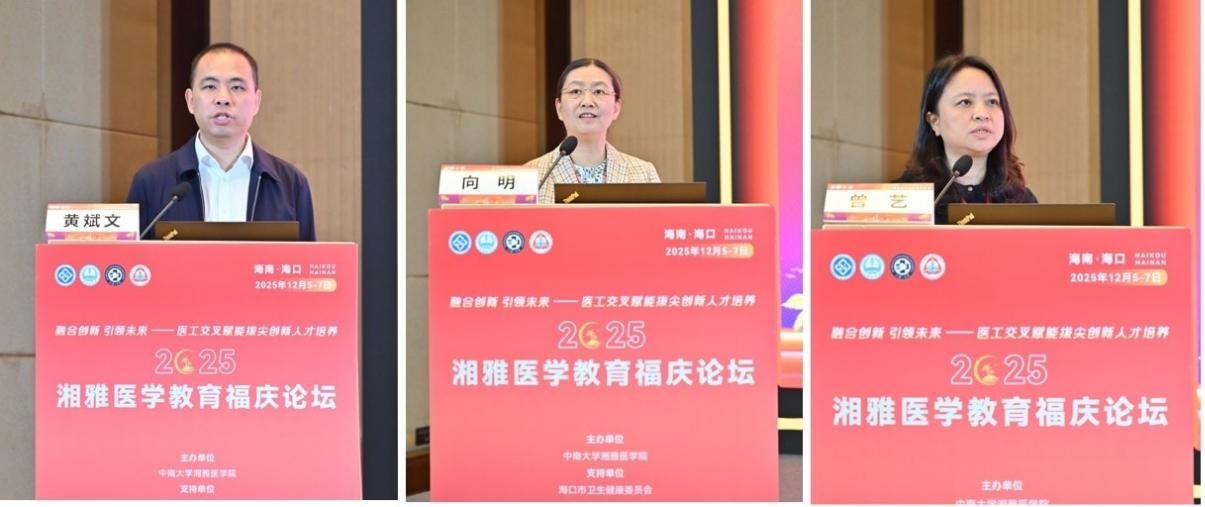 12月6日上午,论坛在海口国宾馆拉开帷幕。开幕式上,谈球吧附属海口医院党委书记莫少雄首先致欢迎辞,向远道而来的专家学者表示热烈欢迎。中南大学湘雅三医院党委书记何庆南、谈球吧党委书记朱利勇先后致辞,回顾了“求真求确、必邃必专”的湘雅精神,强调了在当代医学教育中追求学科融合与创新人才培养的重要性。中南大学副校长黎志宏作总结讲话,他指出,面对全球健康挑战与科技革命的交汇,医学教育必须主动打破学科壁垒,湘雅有责任与全国同仁一道,探索医工交叉育人的系统性解决方案。