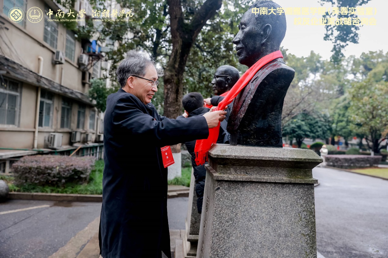 Before the meeting, alumni entrepreneurs visited various schools and departments on the new campus of Xiangya, including Xiangya School of Public Health, Xiangya School of Nursing, Xiangya School of Pharmacy, School of Life Sciences, and Xiangya School of Medicine's history museum. They also explored the core area of Furong Laboratory in the old campus of Xiangya. Alumni representatives offered flowers to statues at the old campus, symbolizing the friendship of all Xiangya alumni.
