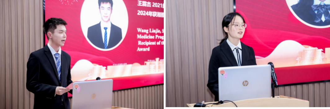 Representative of the 2024 award-winning students, Wang Linjie, and a representative from previous awardees, Wang Feiyang, delivered speeches. They expressed their commitment to continuous self-reflection, the pursuit of knowledge, and ongoing progress. They pledged to inherit the cultural spirit of Xiangya from its 110-year history, showcase the brilliance of Xiangya youth, and navigate the vast ocean of medicine with determination to become compassionate and dedicated “great doctors.”