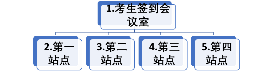 病史采集采用腾讯会议的形式,为保证各环节顺利进行,每家医院各安排5名考务人员,预约5场腾讯视频会议,具体组织形式如下图,考生签到会议室请考生入会后根据附件1(2020年OSCE病史采集站考生安排表)中的具体轮次改名为“轮次姓名”(例:第一轮王xx),并在主持人通知后进入相对应的各站点会议室(参见附件2.2020年OSCE各考点腾讯会议号),考生与考官同时开启音频和视频进行考核。考试过程中,仅考生、考官、SP以及考务人员入会,每个站点每位考生完成时间为7.5分钟,上一名考生结束后下一名考生进入会议室,若考核结束后考生未离开线上会议室,由考务人员将其移出。各站点具体的时间和考生安排参见附件1(病史采集考生安排表)。