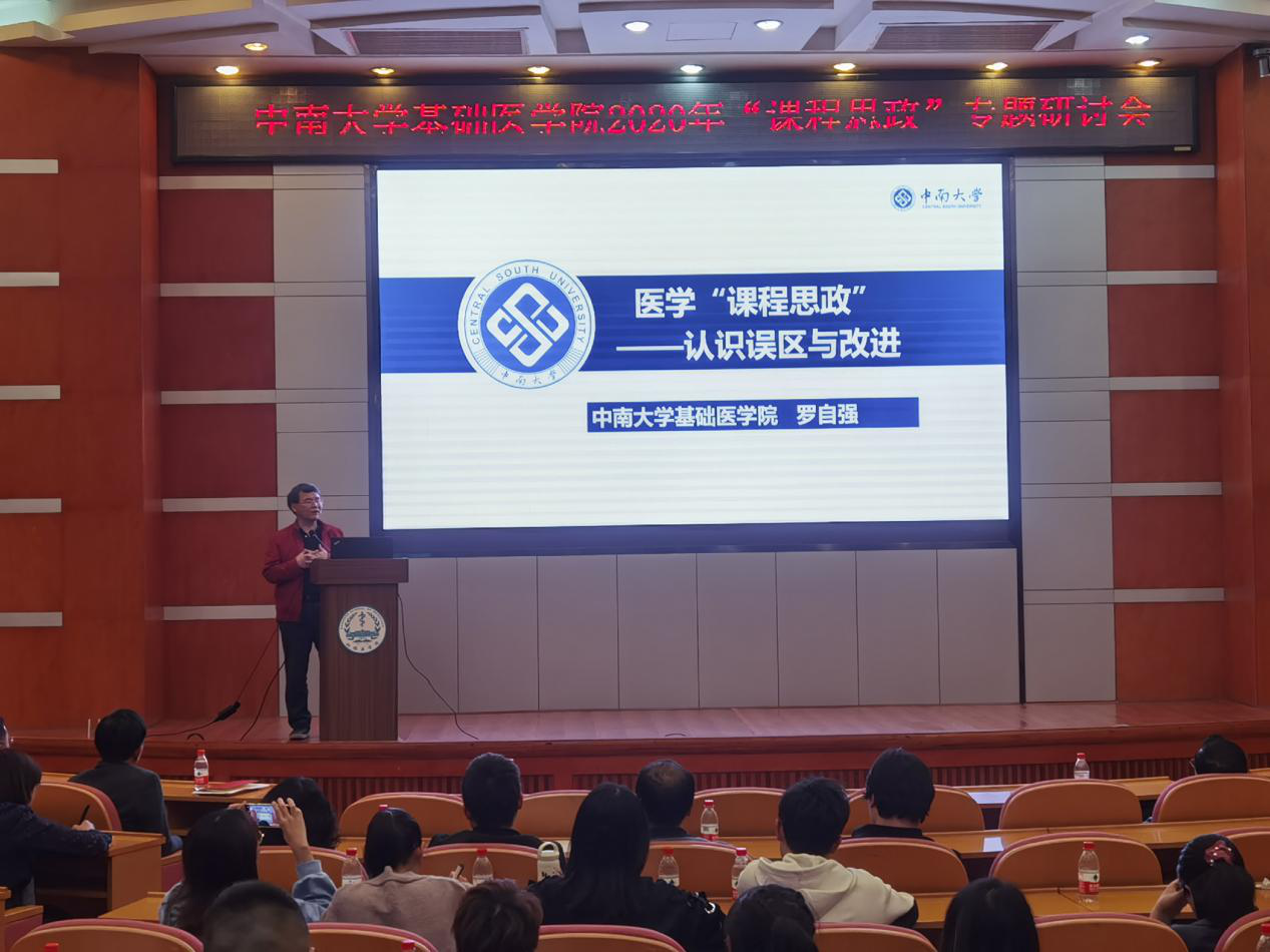 11月10日下午4点,基础医学院2020年“课程思政”专题研讨会在福庆楼四楼报告厅顺利召开。本次研讨会由基础医学院罗自强教授和张华莉教授主讲,湘雅医学院副院长陈俊香,基础医学院党委书记李顺长、副书记刘谭明和近120名师生参加了会议。会议由基础医学院副院长管茶香教授主持。