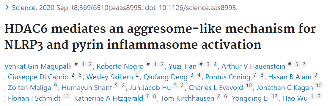 据悉,该项研究由美国哈佛大学教授Hao Wu和 密西根大学Yongqing Li教授共同指导完成,揭示了由组蛋白脱乙酰基酶6(HDAC6)介导的NLRP3与吡喃炎症小体的激活信号通路。该信号通路与蛋白质降解过程中聚集体形成有着类似的机制,由此也揭示了微管组织中心在炎症小体的激活和抑制中的双重作用,为治疗炎症小体介导的疾病治疗提供新的靶点。