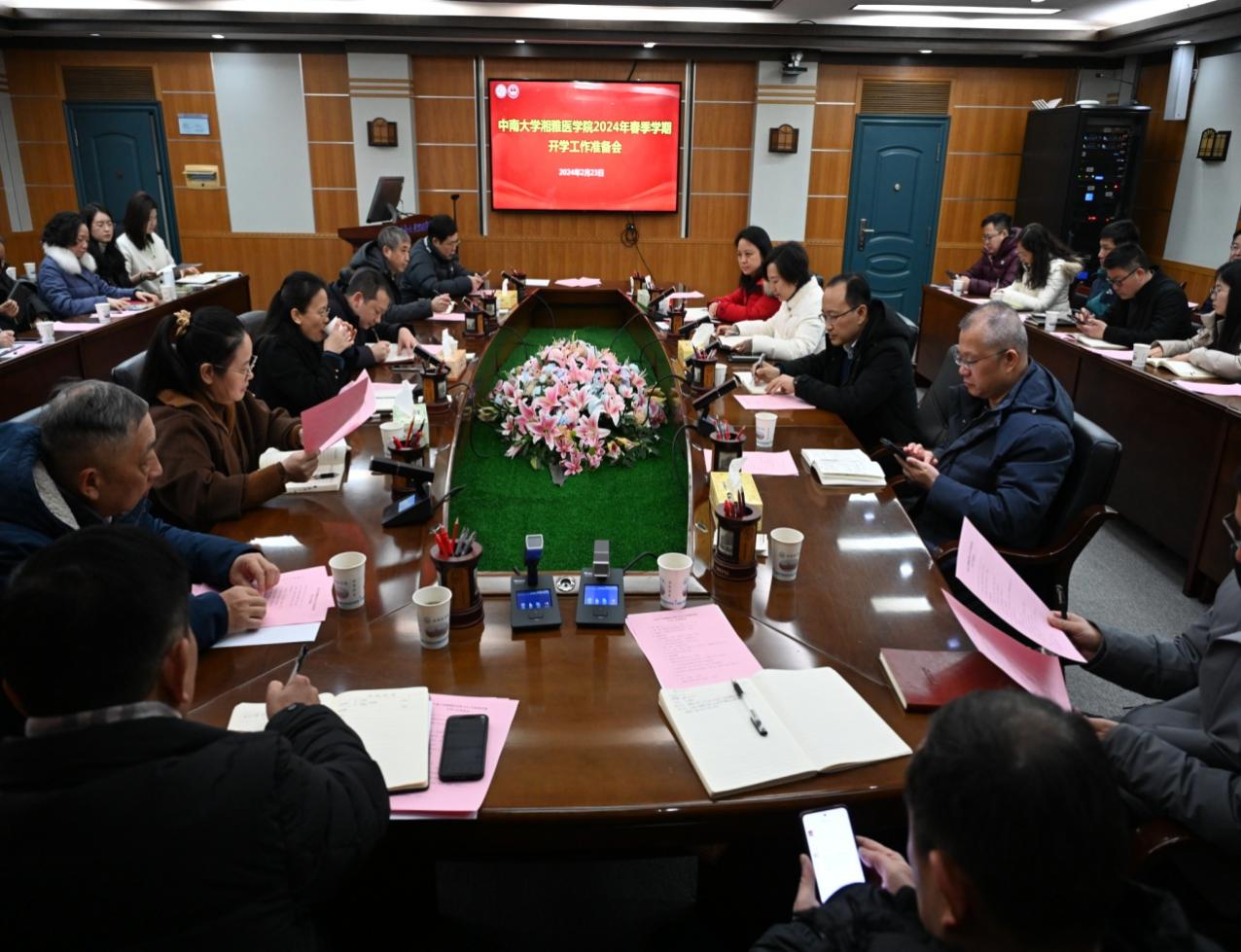 为切实做好新学期开篇布局,保障开学后各项工作有序开展,2024年2月23日上午,谈球吧在湘雅新校区孝骞楼八楼二会议室组织召开了2024年春季学期开学工作准备会。湘雅医学院党委书记常实、党委副书记吴世明、副院长曾艺,医口6个二级学院副书记、教学副院长,3个附属医院教学副院长、教务部主任,麻醉系、精卫系、检验系主任,学校保卫处、物业、宿管、饮食中心、信网中心等职能部门湘雅校区负责人及湘雅医学院综合办、学工办、医学教育办相关人员参加会议。会议由湘雅医学院常务副院长武明花主持。