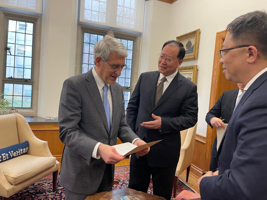 During their stay in the United States, Chen Xiang and the delegation met with Prof. Peter Salovey, President of Yale University, Prof. Nancy J. Brown, Dean of the Yale School of Medicine, and Mr. John Frisbie, President of the Yale-China Association. H.E. Governor Mao Weiming of Hunan Province attended these meetings and highlighted the enduring friendship between Hunan, Yale University, and the Yale-China Association as a model of people-to-people exchanges between China and the United States. They discussed plans to further strengthen cooperation between the two sides, particularly in medicine, healthcare, education, and research, to enhance bilateral exchanges and cooperation.