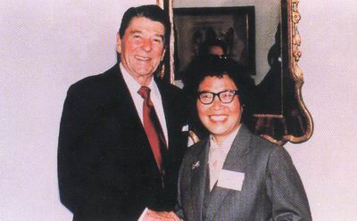 1984年,时任美国总统在白宫举行中国学者招待会,图为前总统里根与本校陈慕竹教授合影