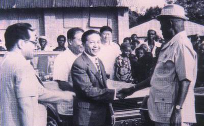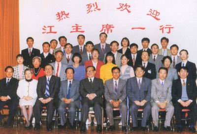 1996年5月,中华人民共和国主席江泽民出访非洲,在津巴布韦接见了我国驻津机构援外人员时,称赞了本校医疗队员的工作精神.图为江主席和本校医疗队员胡建中、张科建等合影